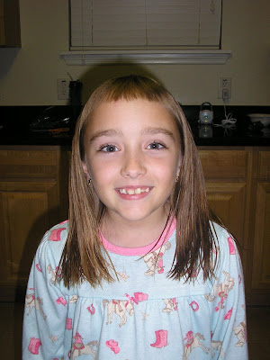 No need to say “I told you so.” This is going to take a couple of years to grow out. Bangs do not work well with Sydney because she has a slight cowlick at the front of her natural part so they don’t lay down nicely. Oh well.