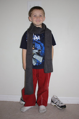 I finished my first Knitted project! The result: a grey scarf for Peter (he was not at home to model it so I hired a professional for the job).